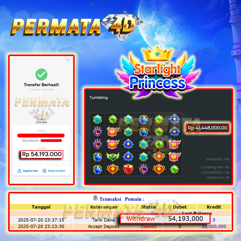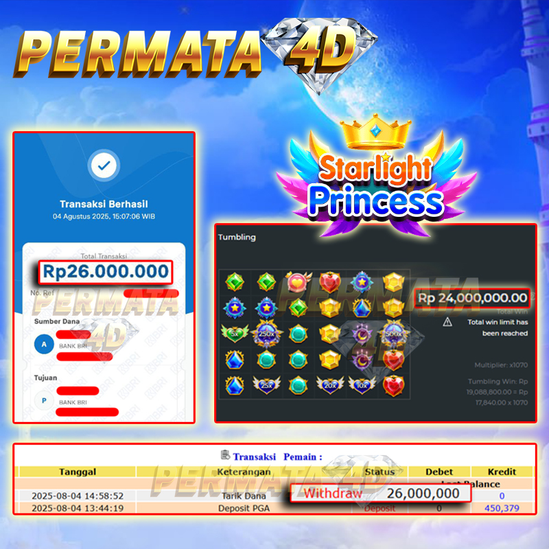 Selamat Kepada Member PERMATA4D STARLIGHT PRINCESS 1000 User id JA******